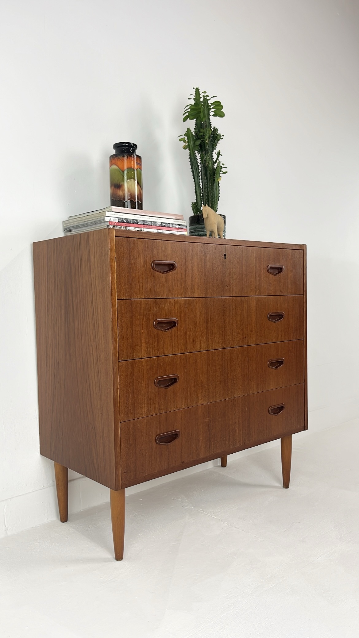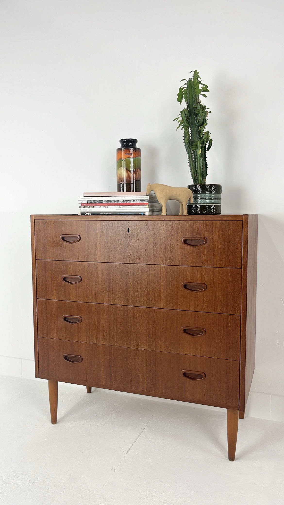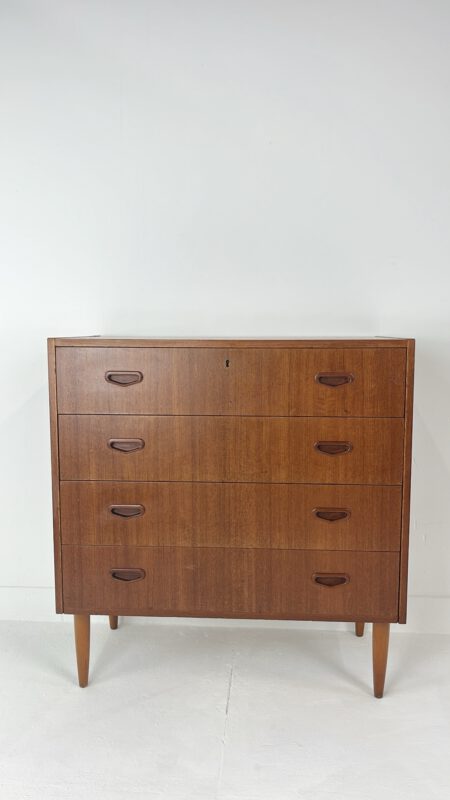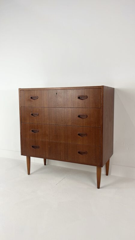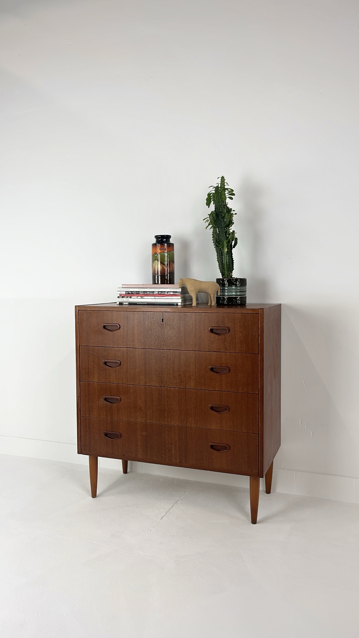 Mooie vintage ladekast van houtfineer met vier ruime lades en subtiele handgrepen. Het minimalistische design en de mooie houttekening zorgen voor een tijdloze look. De kast heeft cilinder vormige houten poten en biedt veel praktische opbergruimte. De kast is op enkele plekken gerestaureerd, zo is een stuk fineer vervangen aan de linker bovenkant van de kast. Waar nodig is de kast opgeknapt en zijn er stukjes fineer vervangen. De algehele staat van de kast is goed.