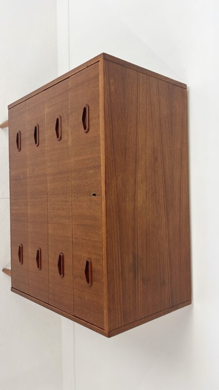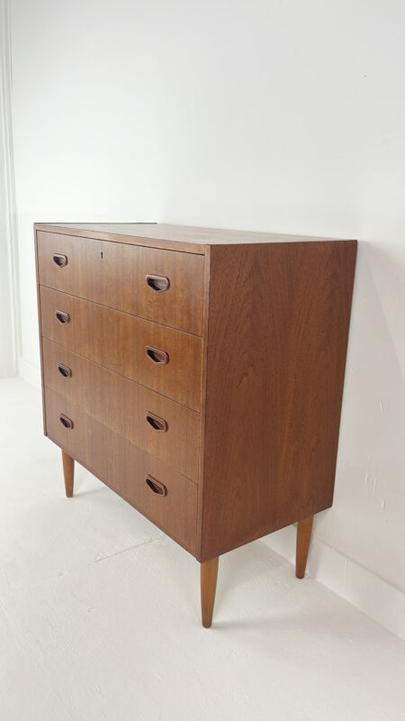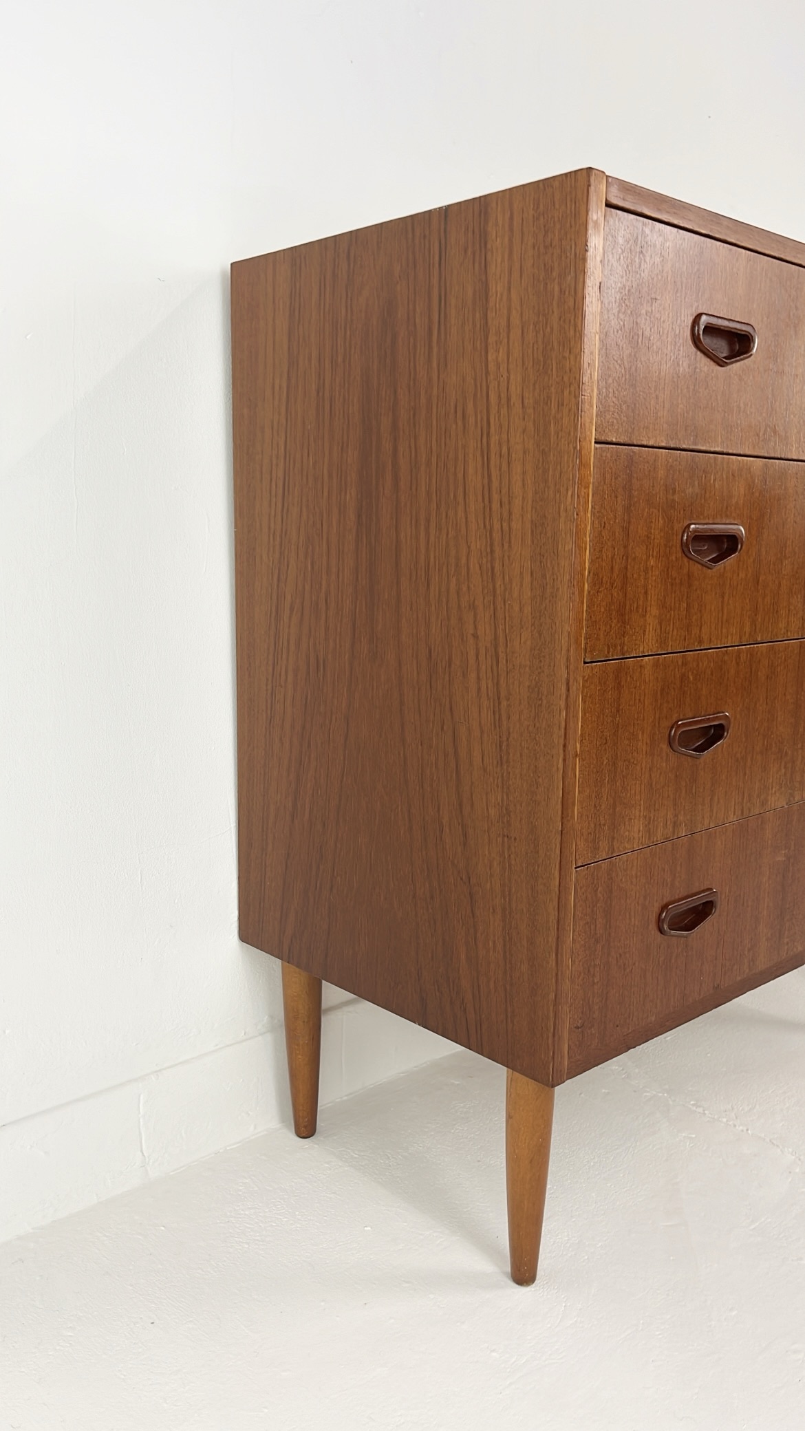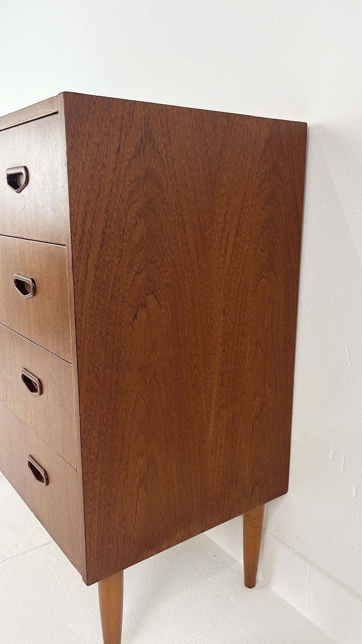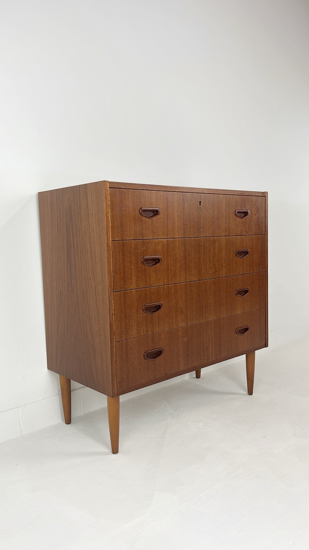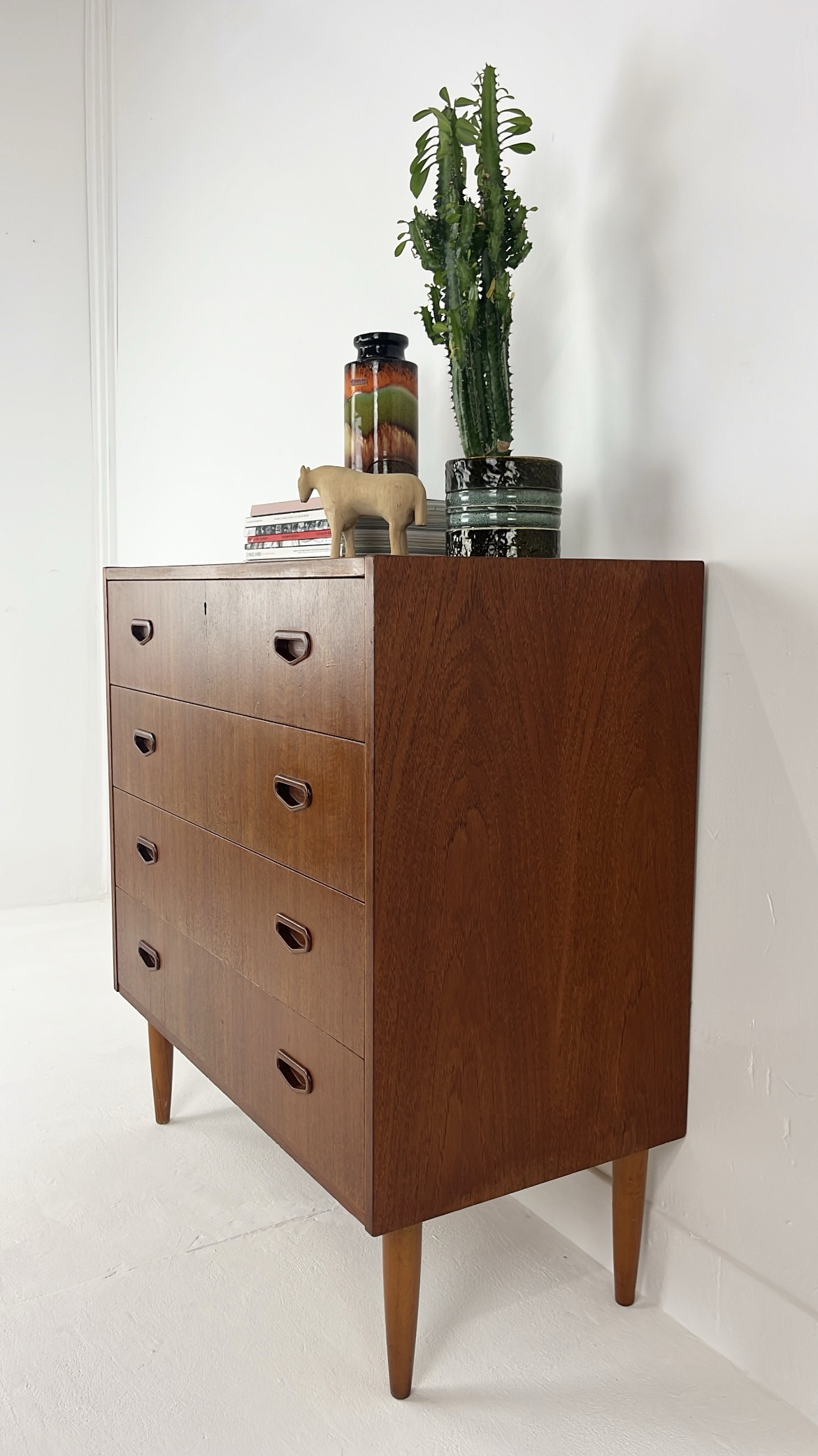 Mooie vintage ladekast van houtfineer met vier ruime lades en subtiele handgrepen. Het minimalistische design en de mooie houttekening zorgen voor een tijdloze look. De kast heeft cilinder vormige houten poten en biedt veel praktische opbergruimte. De kast is op enkele plekken gerestaureerd, zo is een stuk fineer vervangen aan de linker bovenkant van de kast. Waar nodig is de kast opgeknapt en zijn er stukjes fineer vervangen. De algehele staat van de kast is goed.