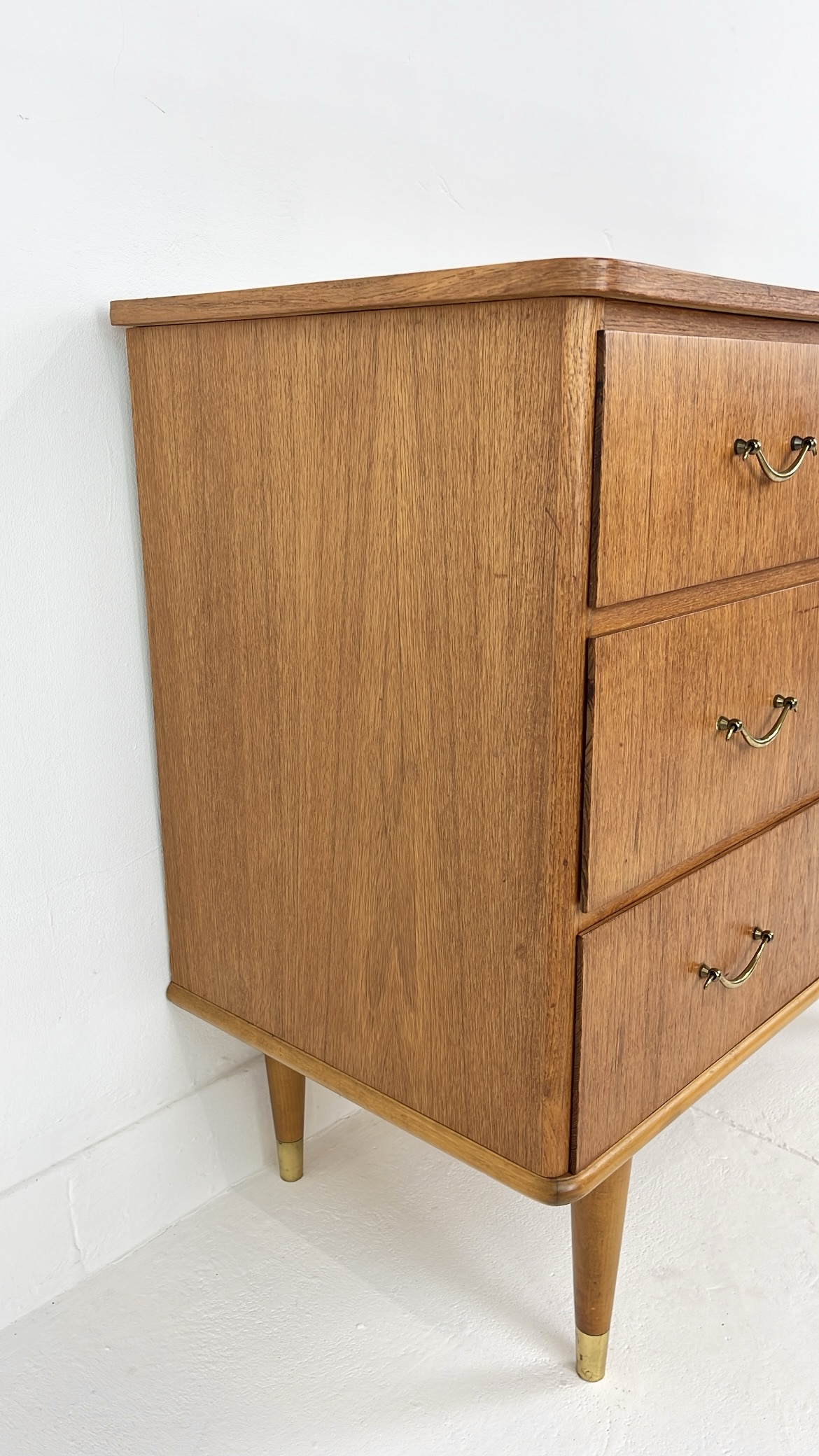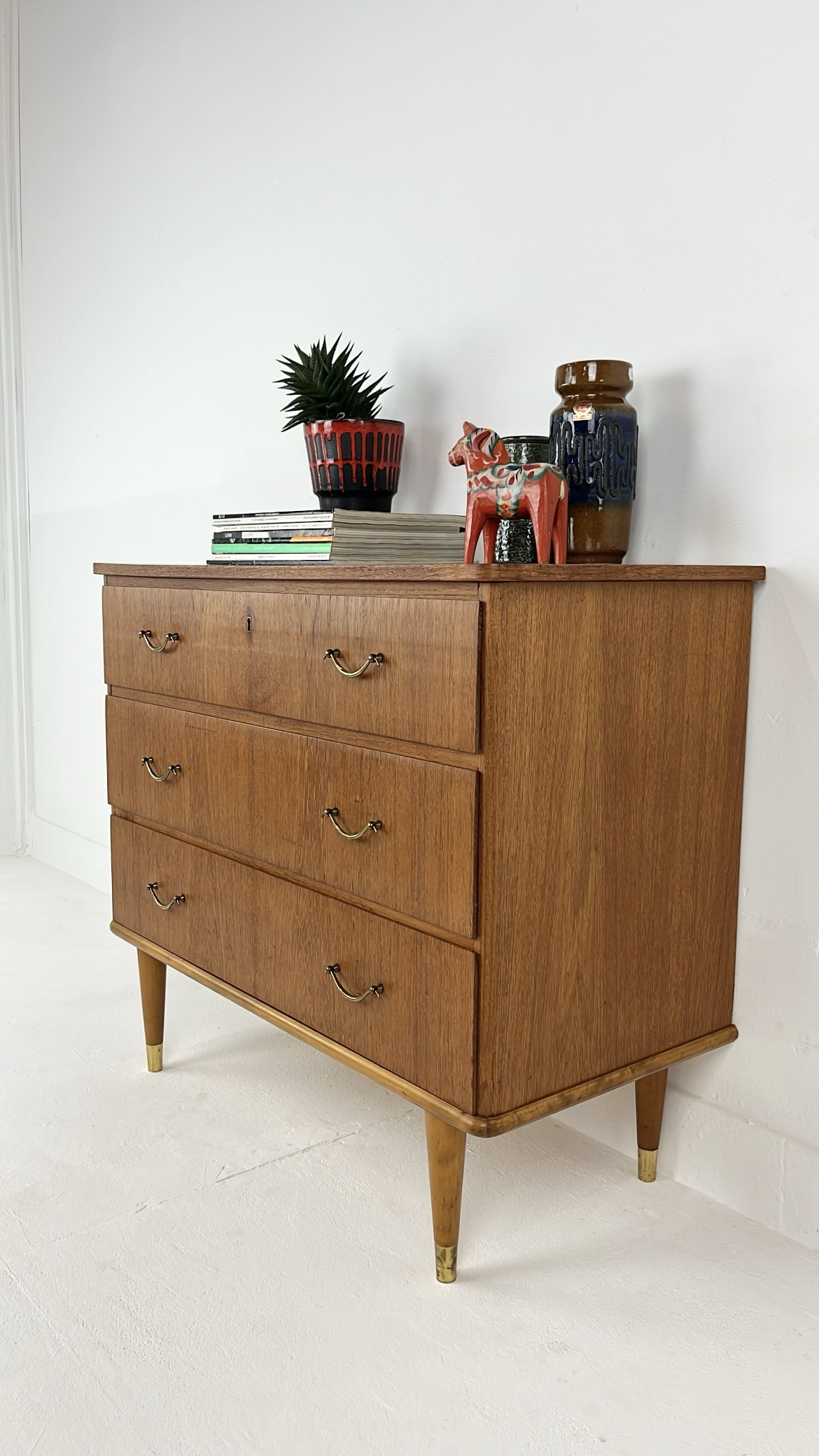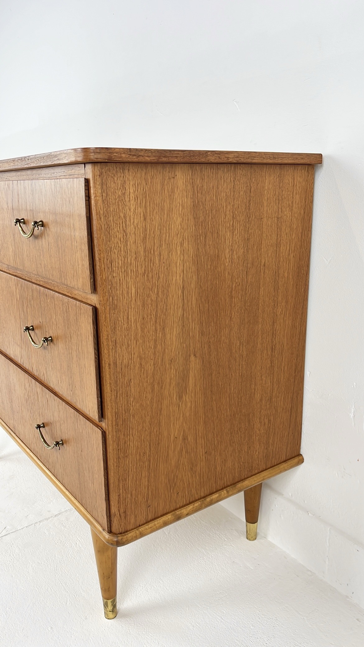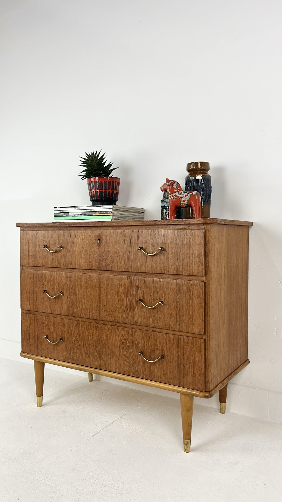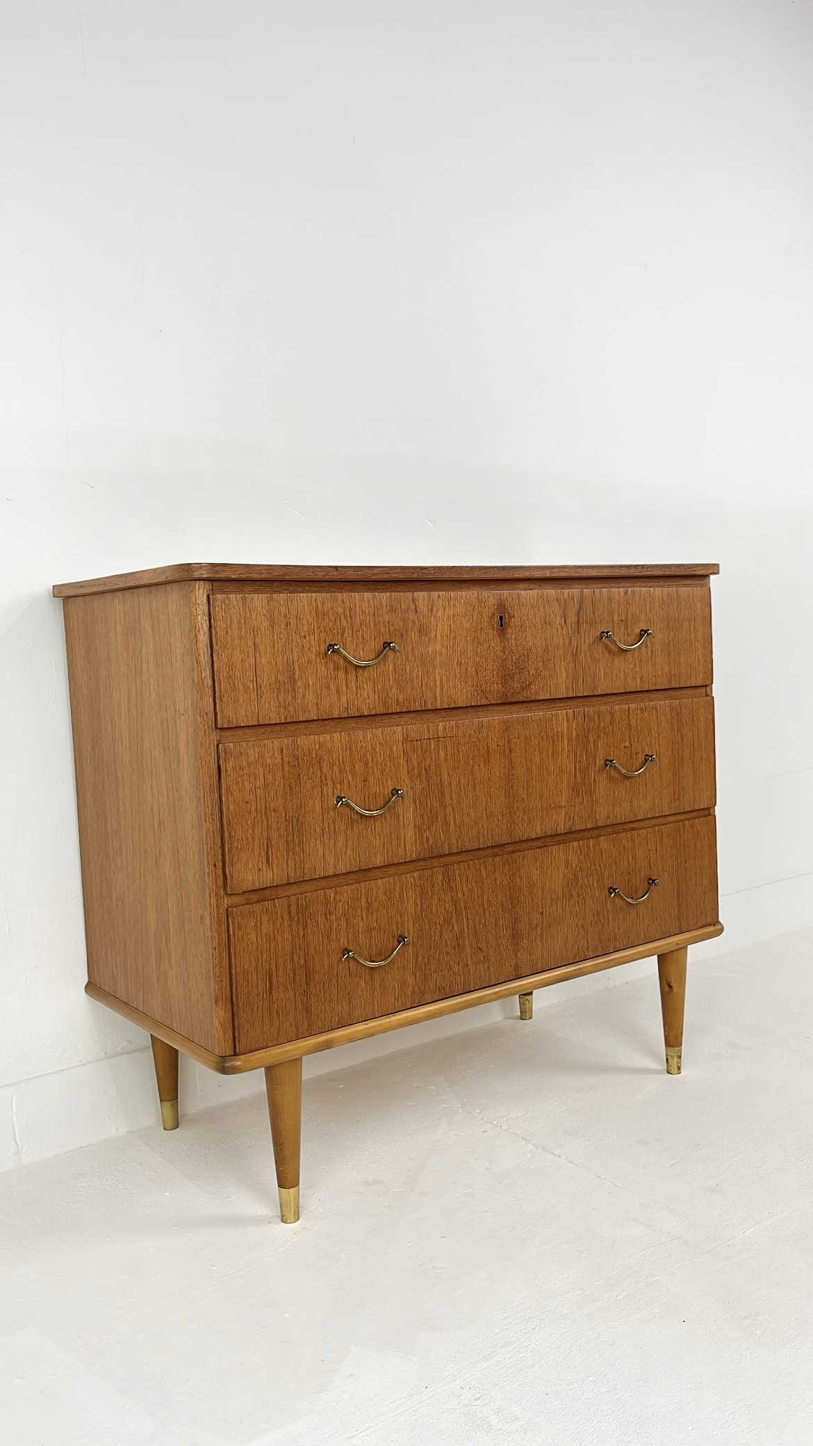 Mooie vintage ladekast van houtfineer met drie ruime lades en elegante metalen handgrepen. De kast is gemaakt met teak fineer. Het warme houtfineer in combinatie met de subtiele messing details aan de poten geeft de kast een stijlvolle mid-century uitstraling. De kast staat op slanke, taps toelopende houten poten met messing doppen. De lades bieden veel praktische opbergruimte. Waar nodig is de kast gerestaureerd en zijn kleine oneffenheden bijgewerkt. De algehele staat van de kast is goed.