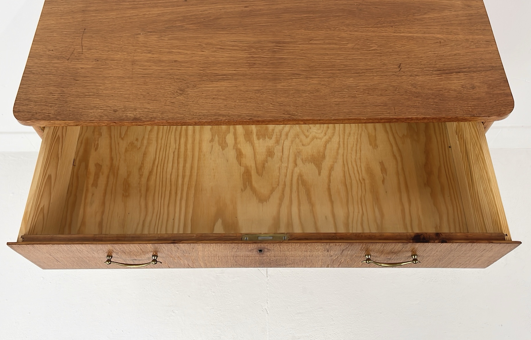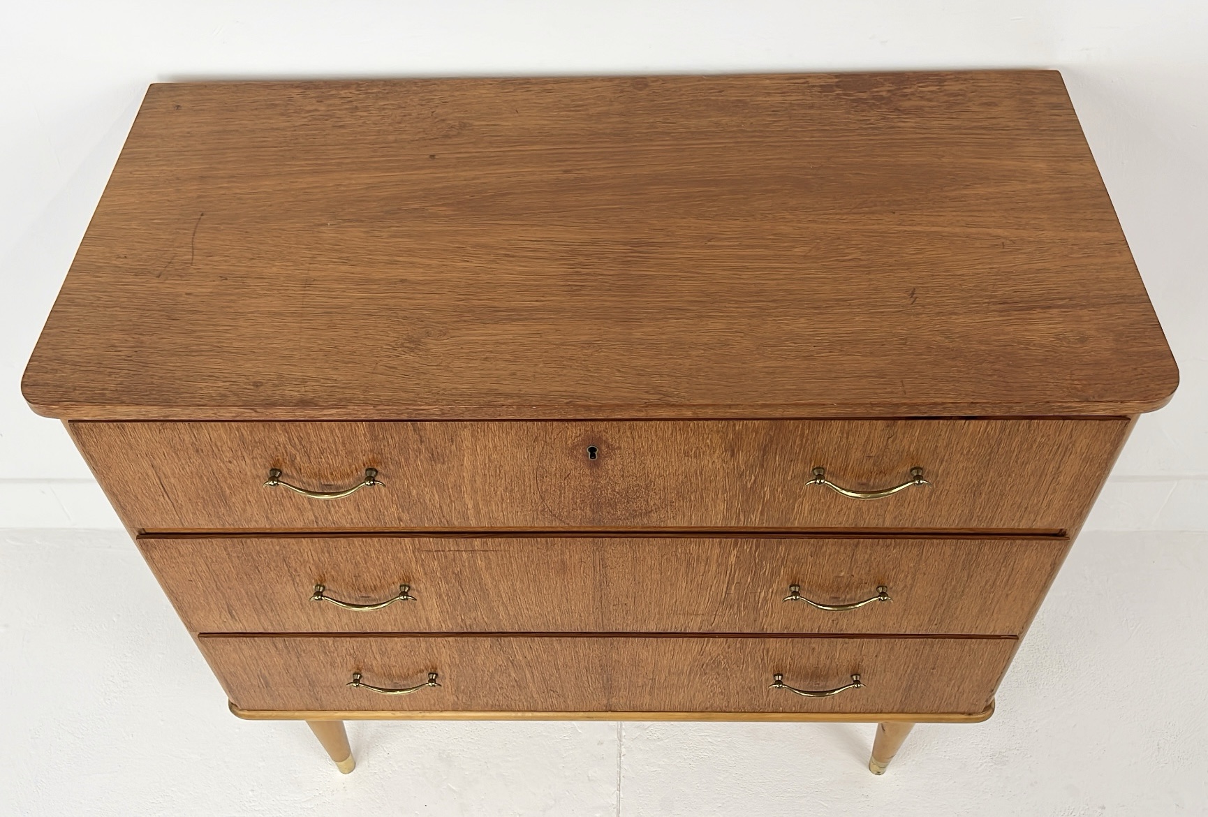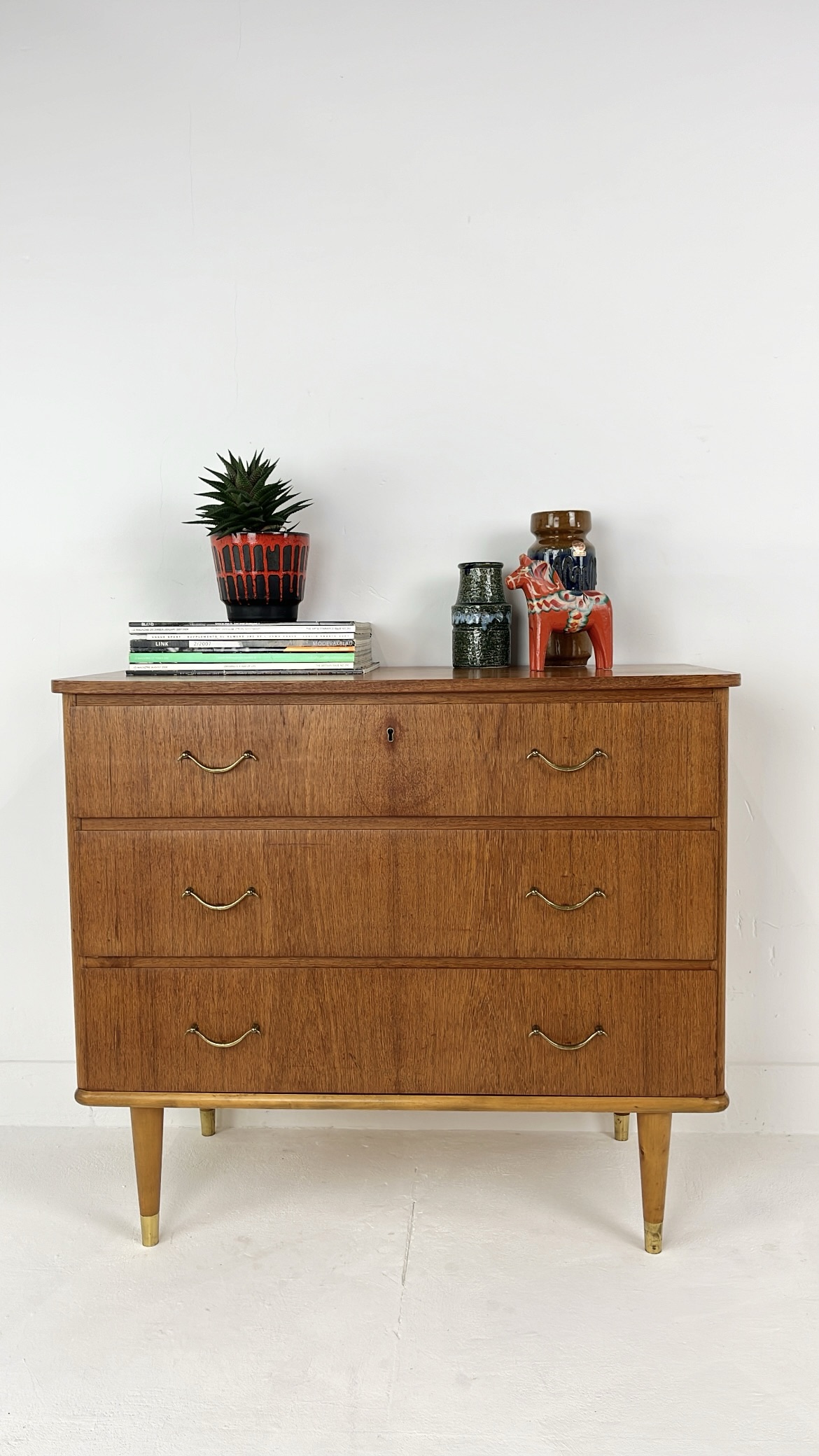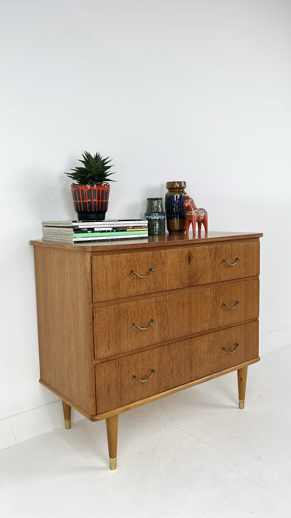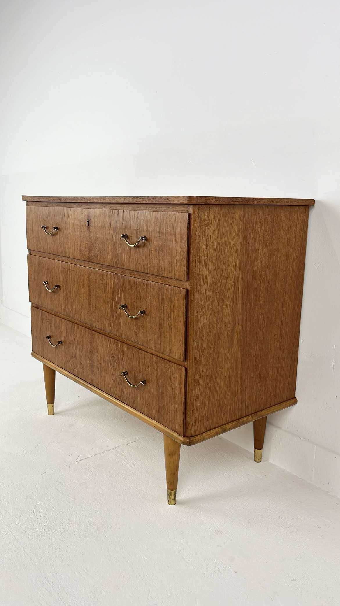 Mooie vintage ladekast van houtfineer met drie ruime lades en elegante metalen handgrepen. De kast is gemaakt met teak fineer. Het warme houtfineer in combinatie met de subtiele messing details aan de poten geeft de kast een stijlvolle mid-century uitstraling. De kast staat op slanke, taps toelopende houten poten met messing doppen. De lades bieden veel praktische opbergruimte. Waar nodig is de kast gerestaureerd en zijn kleine oneffenheden bijgewerkt. De algehele staat van de kast is goed.